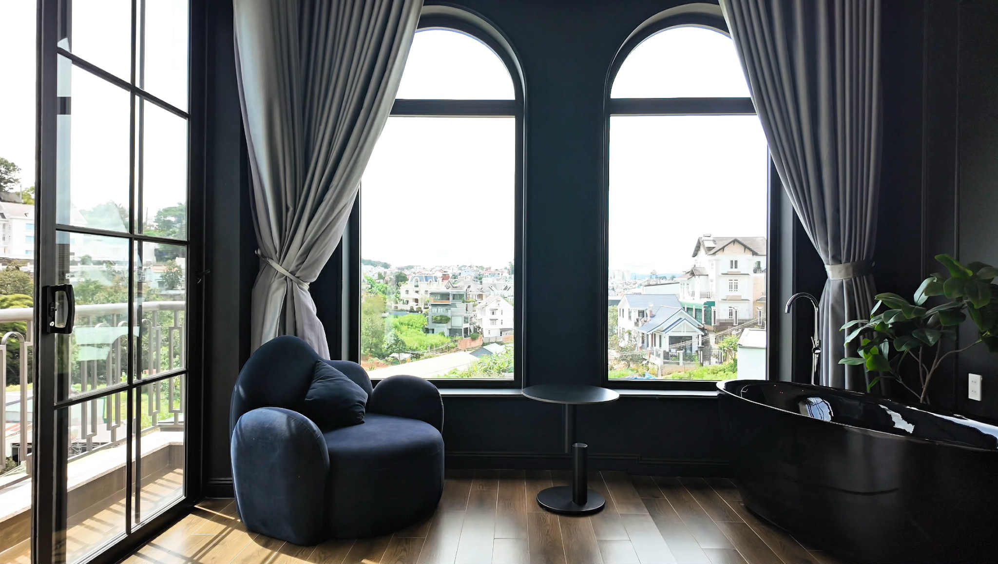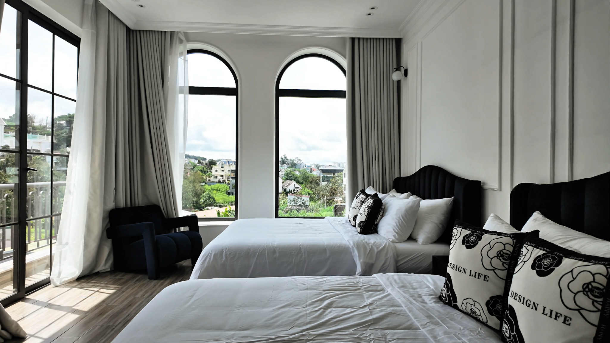 Kết cấu gồm 1 hầm – 1 trệt – 2 lầu, được chia làm 2 căn villa riêng biệt, giúp tối ưu công năng sử dụng. Biệt thự có 7 phòng ngủ chính, 2 phòng backup và 9 toilet, mỗi phòng đều có ban công hoặc cửa sổ lớn đón gió, ánh sáng tự nhiên. Từ các tầng cao, bạn có thể phóng tầm mắt nhìn ra đồi Đống Đa tuyệt đẹp, một trong những điểm ngắm cảnh nổi tiếng của Đà Lạt.